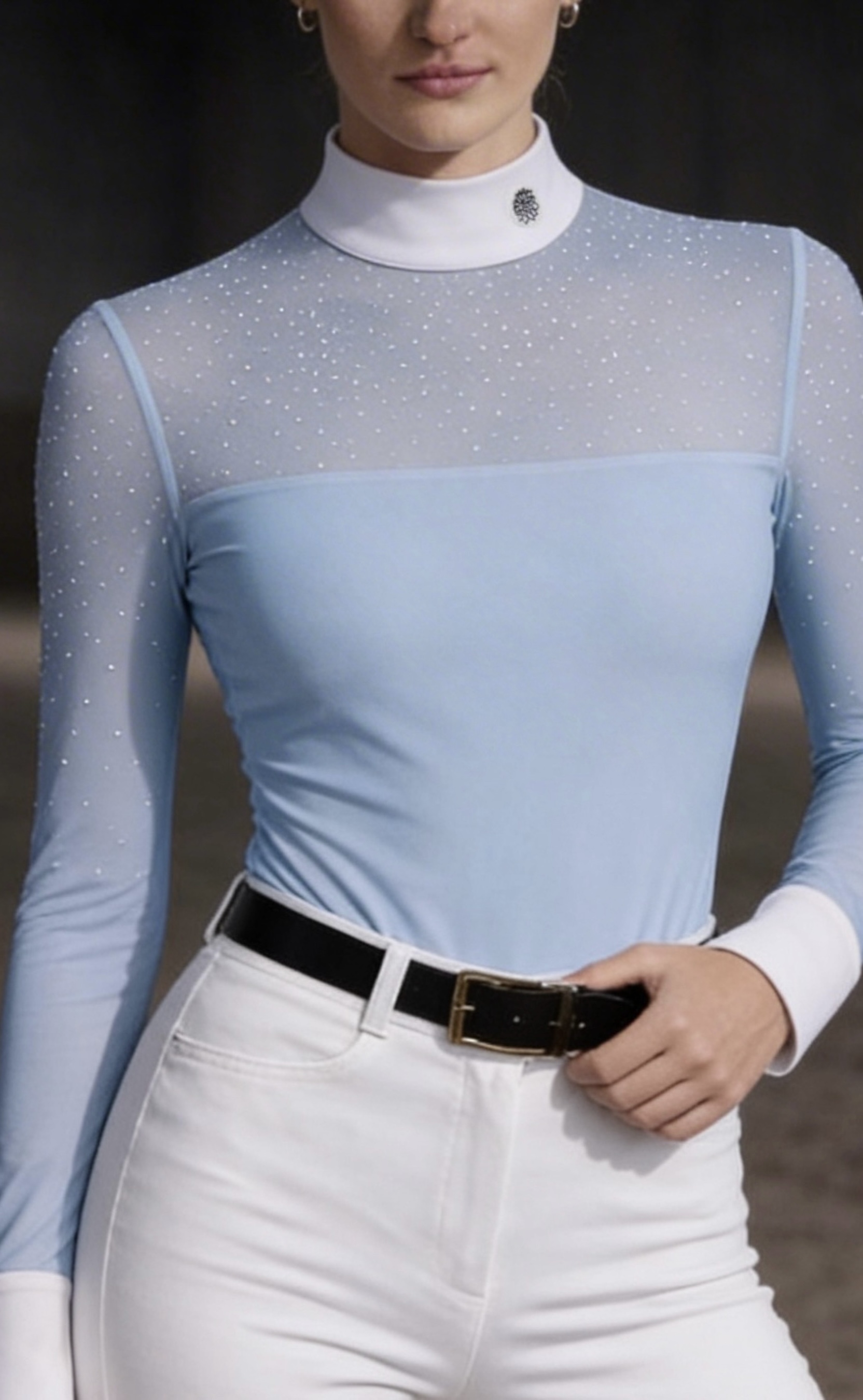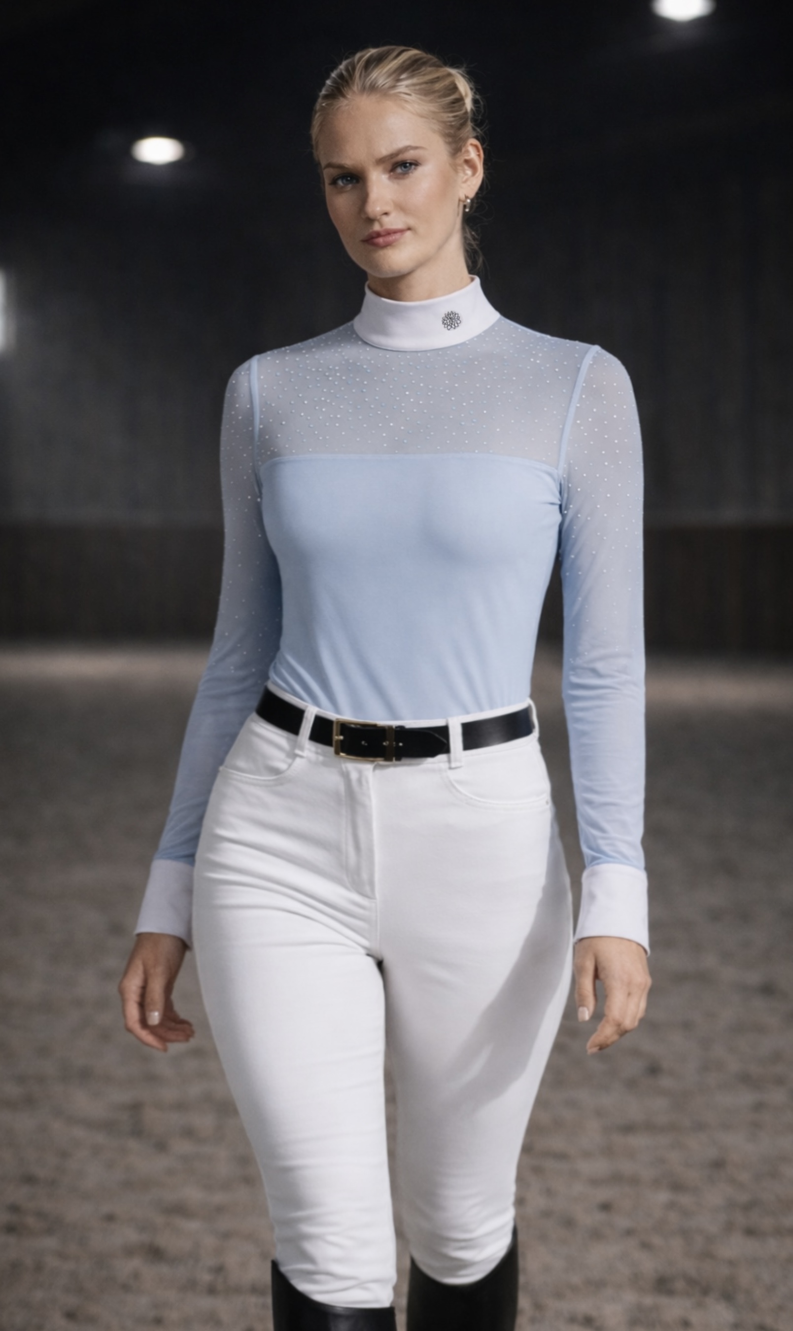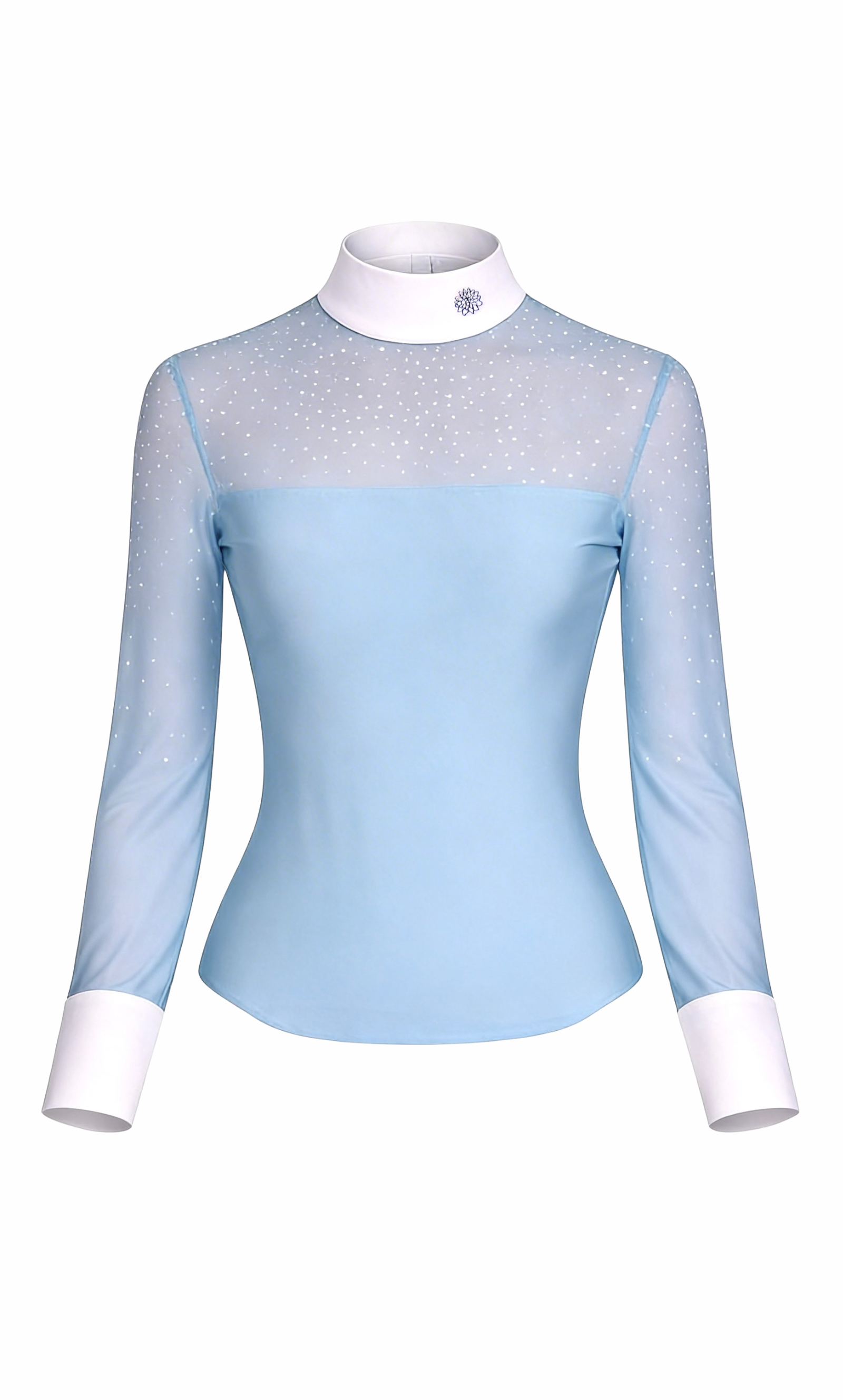 The detailed and carefully designed cut by the designers shapes the silhouette and emphasizes the waist. The shirt has a white stand-up collar, in accordance with the requirements of the Polish Riding Association (PZJ) and FEI.